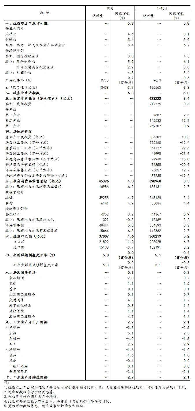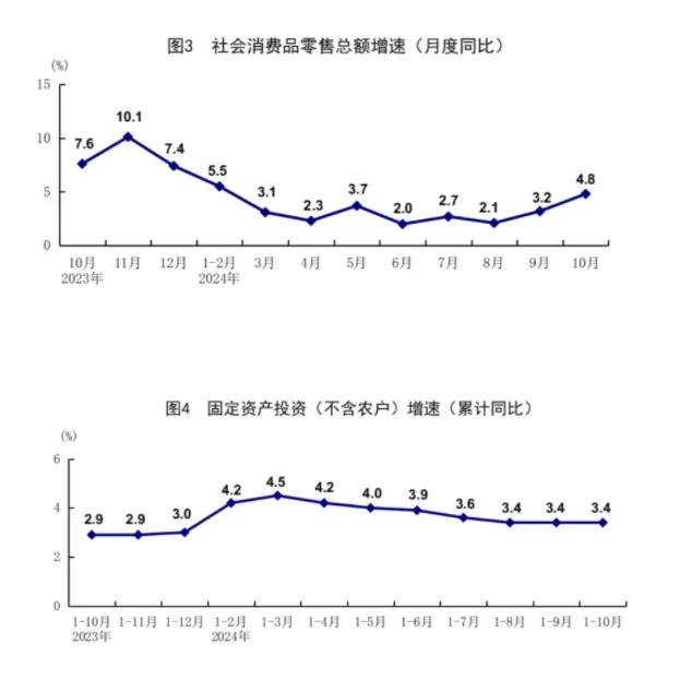 總的來看,10月份隨著存量政策加快落實以及一攬子增量政策加力推出,國民經(jīng)濟運行穩(wěn)中有進,主要指標(biāo)明顯回升,積極因素累積增多。但也要看到,外部環(huán)境更趨復(fù)雜嚴(yán)峻,國內(nèi)有效需求偏弱,經(jīng)濟持續(xù)回升基礎(chǔ)仍待鞏固。下階段,要堅持以習(xí)近平新時代中國特色社會主義思想為指導(dǎo),全面貫徹落實黨的二十大和二十屆二中、三中全會精神,堅持穩(wěn)中求進工作總基調(diào),完整、準(zhǔn)確、全面貫徹新發(fā)展理念,扎實推進高質(zhì)量發(fā)展,加快構(gòu)建新發(fā)展格局,加力推進一攬子增量政策落地落實,鞏固和增強經(jīng)濟回升向好態(tài)勢,努力完成全年經(jīng)濟社會發(fā)展目標(biāo)任務(wù)。
